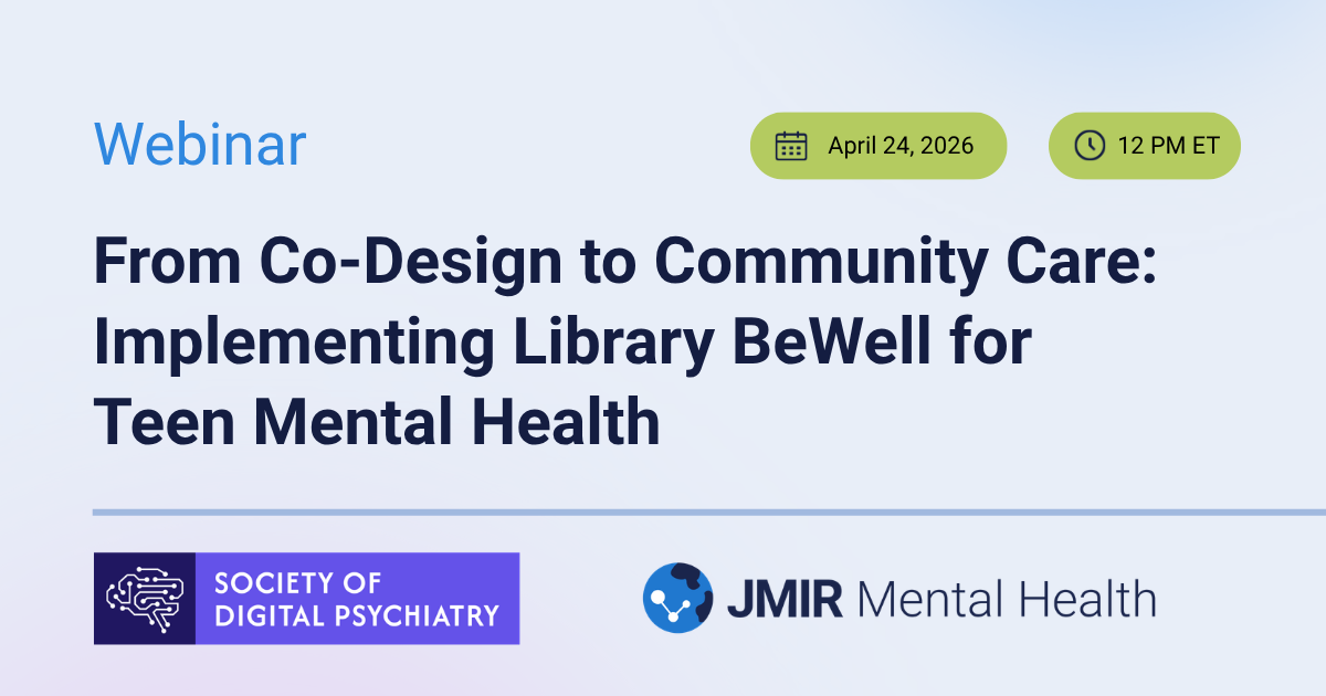 The Society of Digital Psychiatry, in collaboration with JMIR Mental Health—an open-access, peer-reviewed journal published by JMIR Publications—invites you to a webinar titled “From Co-Design to Community Care: Implementing Library BeWell for Teen Mental Health.”